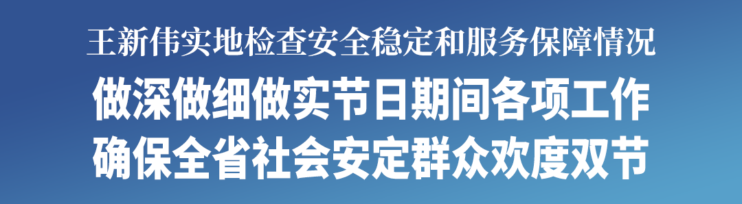 国庆中秋假期即将来临之际,9月29日,省委副书记、省长王新伟实地检查安全稳定和服务保障情况,看望慰问一线工作人员,代表省委、省政府和省委书记郝鹏,向全省人民致以节日问候和祝福,强调要深入贯彻习近平总书记在辽宁考察时的重要讲话和重要指示精神,落实省委要求,做深做细做实节日期间各项工作,确保全省社会安定、群众欢度双节。